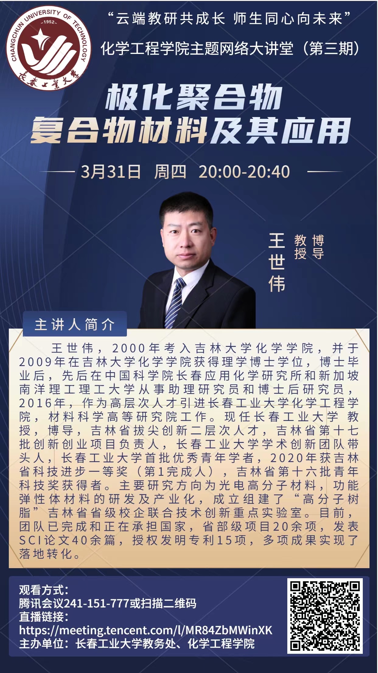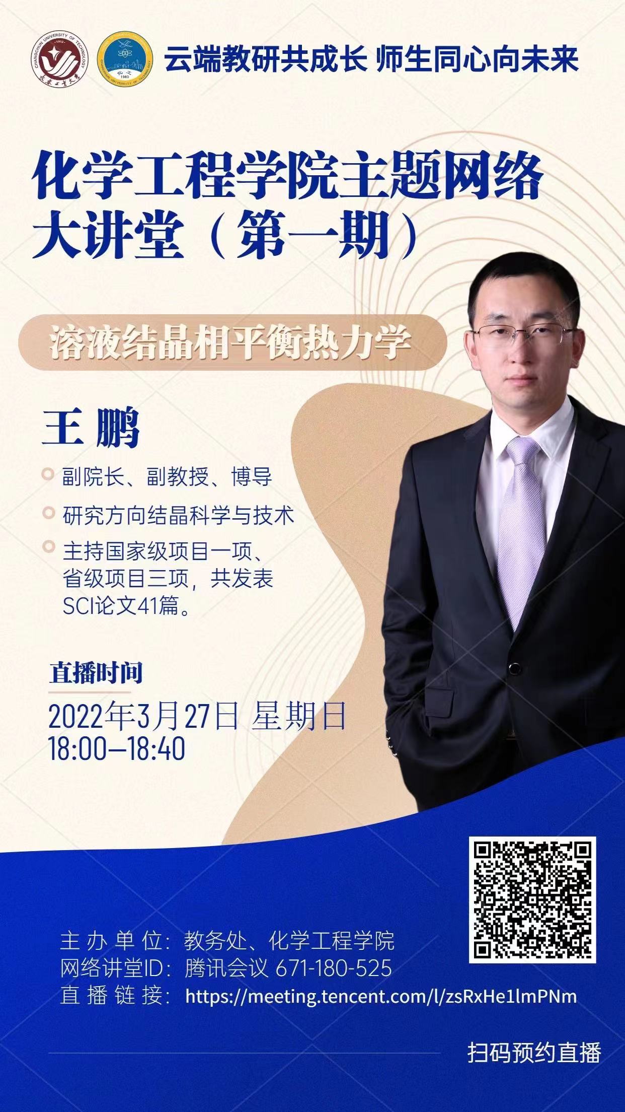 为增强战胜疫情的信心,缓解学生的焦虑情绪,丰富学术和文化生活,由教务处和51大赛 主办,面向在校本科生和研究生推出“云端教研共成长 师生同心向未来”51大赛 主题网络大讲堂系列活动。每期邀请一位主讲嘉宾在腾讯会议线上进行报告(报告30分钟,讨论10分钟),以学术报告、教研讲座、思政讲座、科普讲座等形式与同学们深入交流,为同学们带来人文关怀与学术素养熏陶。第一期定于3月27日(星期日)晚18:00举行,第二期于3月29日(星期二)晚20:00举行,之后会陆续发布系列报告时间,具体信息见海报,欢迎大家观看直播。