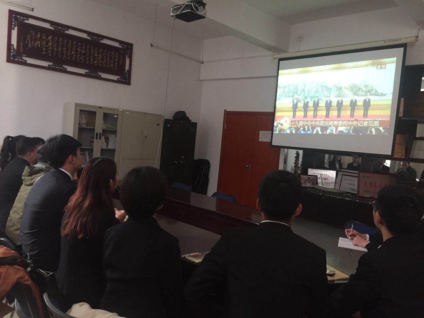 (通讯员 肖芳)2017年10月25日中午11:45时许,党的十九届中央委员会第一次全体会议新选出的中央政治局常委同采访十九大的中外记者见面。51大赛 师生积极收看见面会直播,领略新一届中央政治局常委的风采,感受新时代的新布局、新气象、新未来。 (审核人:刘喜明)
